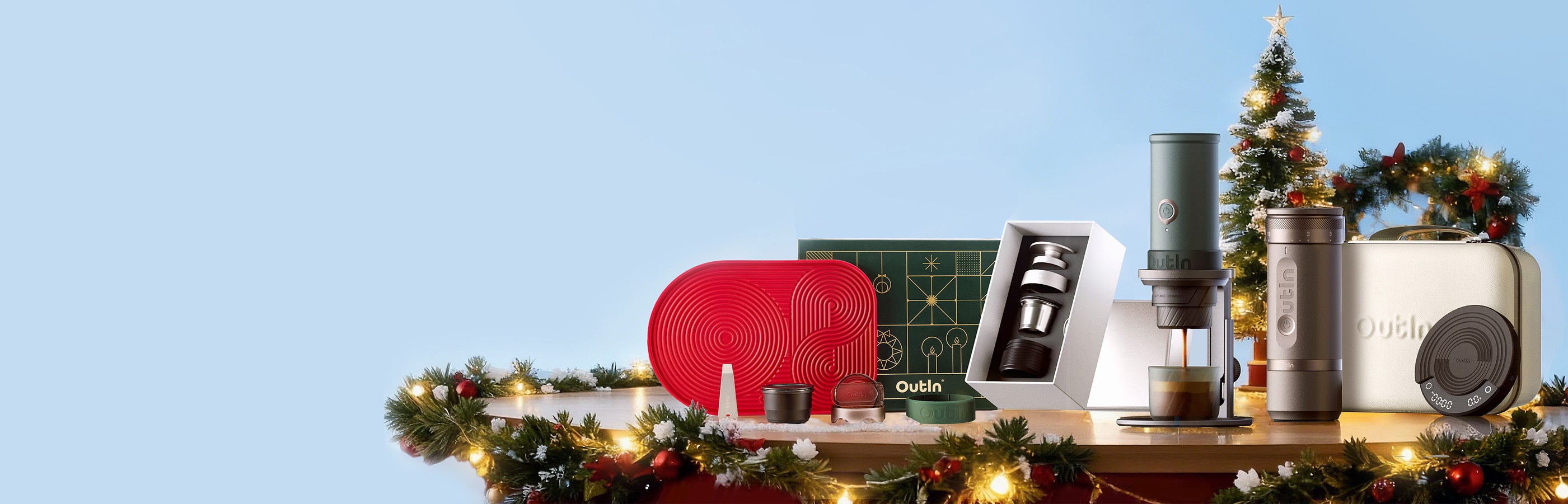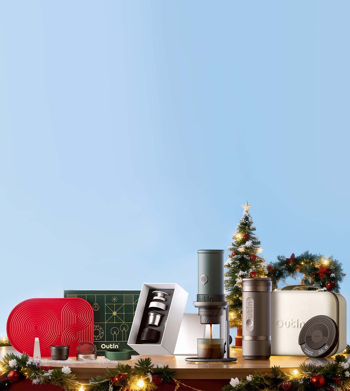 Conozca el conjunto móvil completo: el poderoso Mino Christmas Gift Set (299.99 €) para preparar café, el soporte universal para café (39.99 €) para la estabilidad, y la Escala Claro (49.99 €) para una precisión perfecta.