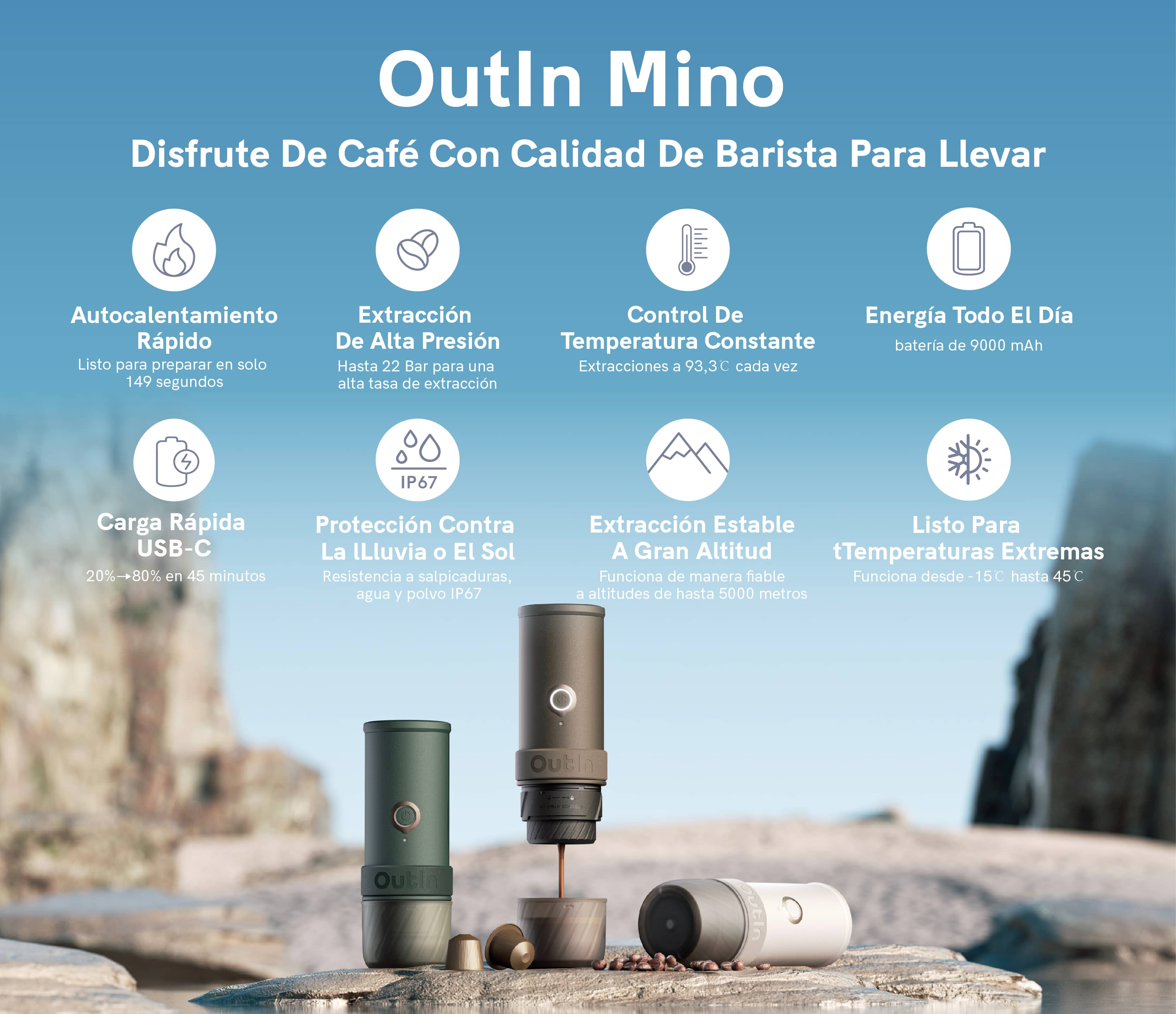 Por otro lado, OutIn Mino está diseñada para los amantes de la naturaleza. Desde desiertos hasta cumbres y selvas profundas, es tu cafetera portátil a prueba de aventuras. Equipada con 22 bares de presión y una bomba especialmente diseñada, la Mino ofrece una extracción de café de nivel barista sin necesidad de accesorios adicionales. Nada más sacarla de la caja, Mino está lista para embarcarte en nuevas aventuras contigo. Creemos en la idea de que menos es más.