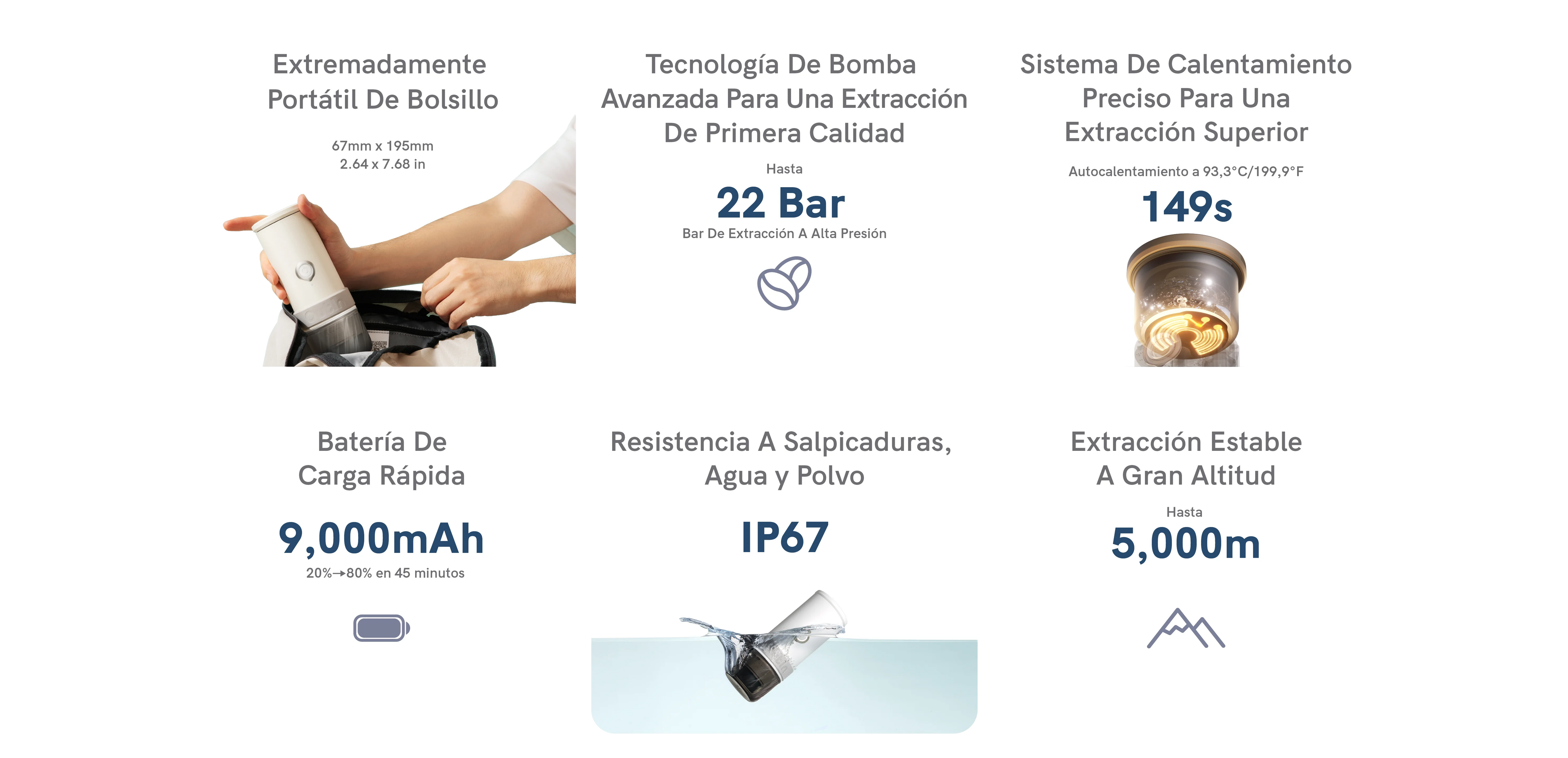 Batería de carga rápida para preparar más tazas de café: Pasa del 20 % al 80 % de carga en solo 45 minutos o alcanza una carga completa en aproximadamente 90 minutos. Su batería de 9.000 mAh prepara hasta 6 tazas con agua a temperatura ambiente o más de 500 tazas con agua caliente por carga.