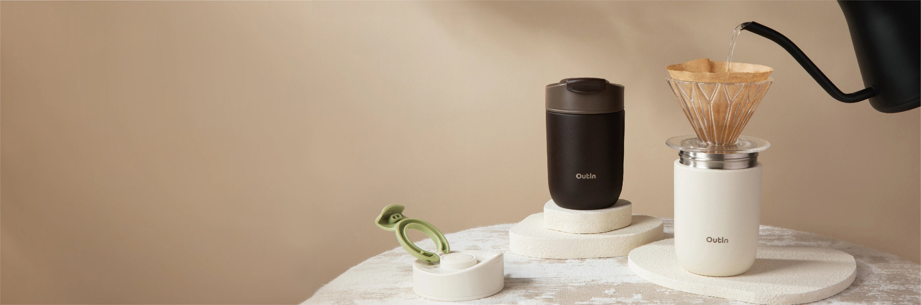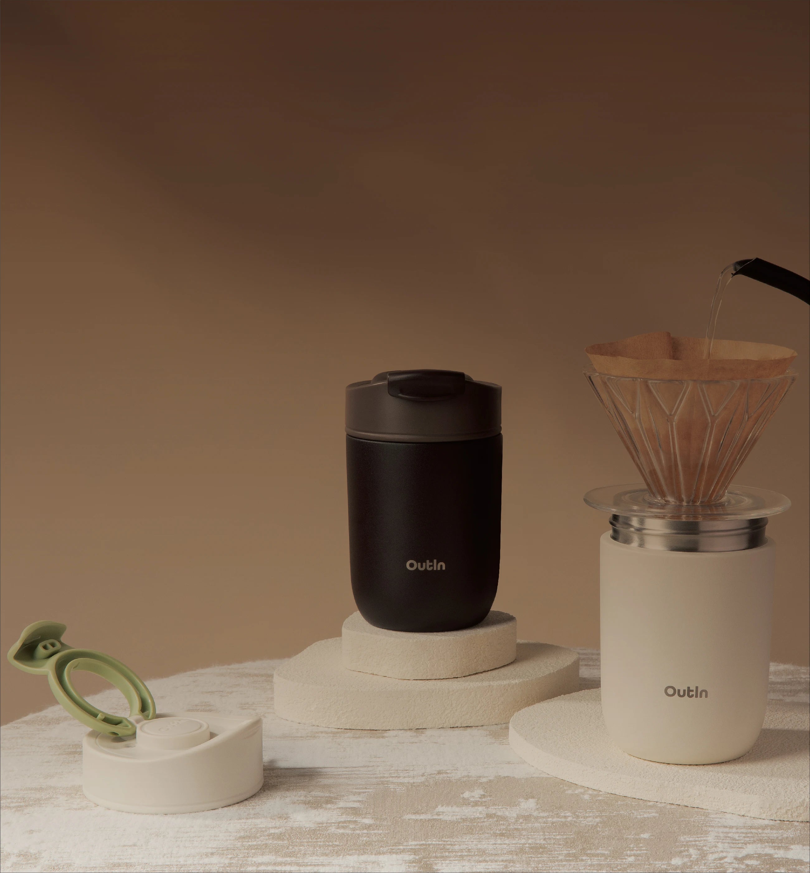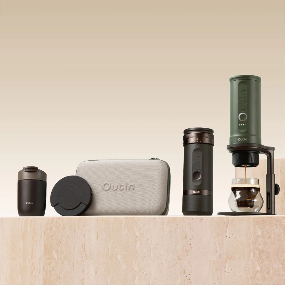 Combine el vaso de viaje OutIn con su OutIn Nano y el soporte de café universal para lograr la mejor configuración de café portátil.