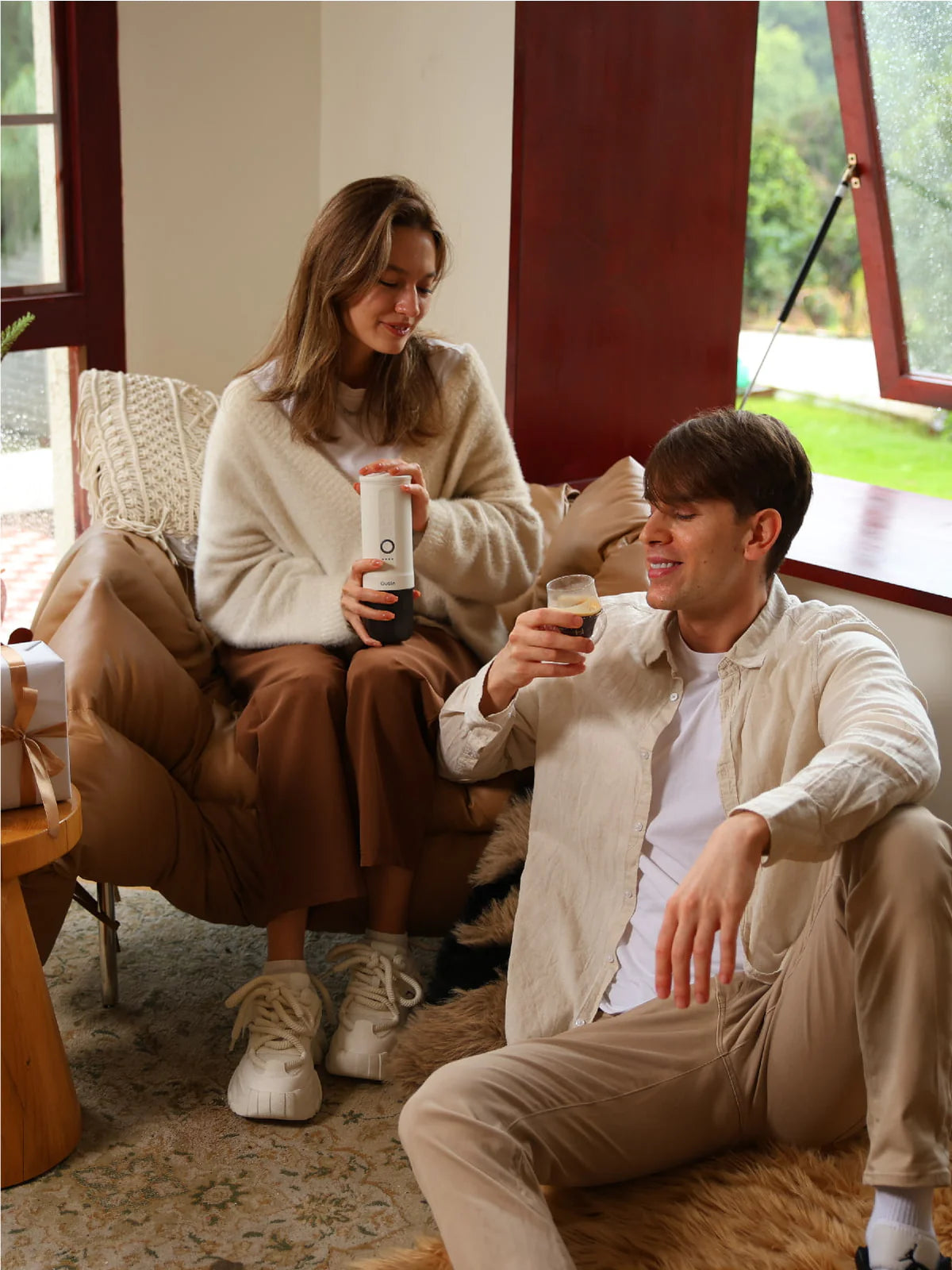 - Con una batería de larga duración de 7500 mAh, puedes preparar hasta 5 cafés con agua fría o más de 200 con agua caliente con una sola carga.